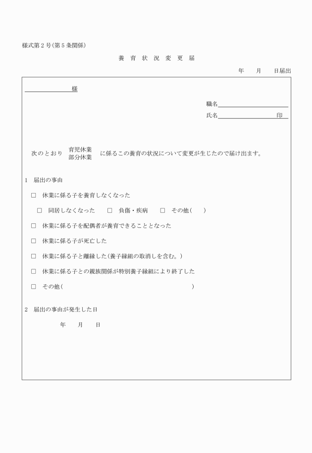 第5条 育児休業をしている職員は、次に掲げる場合には、遅滞なく、その旨を任命権者に届けなければならない。