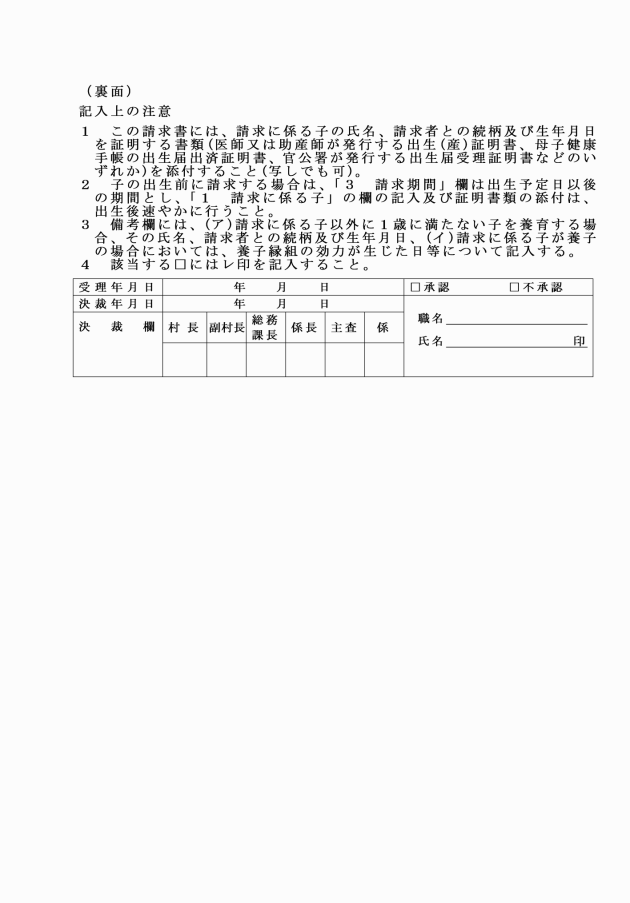 第2条 育児休業の承認の請求は、育児休業承認請求書(様式第1号)により行い、赤村一般職の育児休業等に関する条例(平成23年赤村条例第6号。以下「条例」という。)第3条第7号に掲げる事情に該当して育児休業の承認を請求する場合を除き、育児休業を始めようとする日の1月(次に掲げる場合は、2週間)前までに行うものとする。