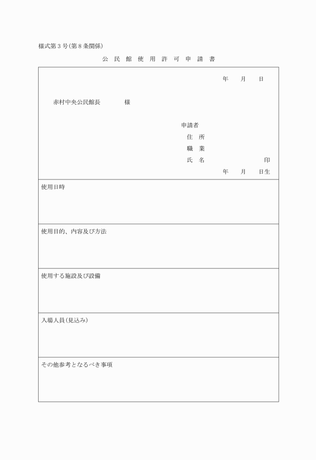 第8条 公民館を使用しようとする者は、事前に公民館使用許可申請書(様式第3号)を館長に提出し、その許可を受けなければならない。