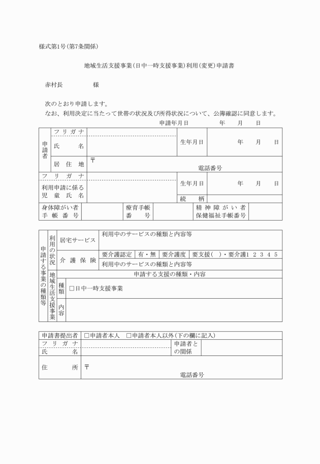 第7条 日中一時支援事業を利用しようとする者(以下「申請者」という。)は、地域生活支援事業(日中一時支援)利用(変更)申請書(様式第1号)を村長に提出しなければならない。