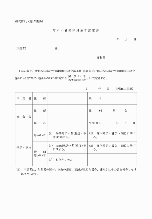 ○赤村高齢者における障がい者控除対象者認定書交付取扱い要綱