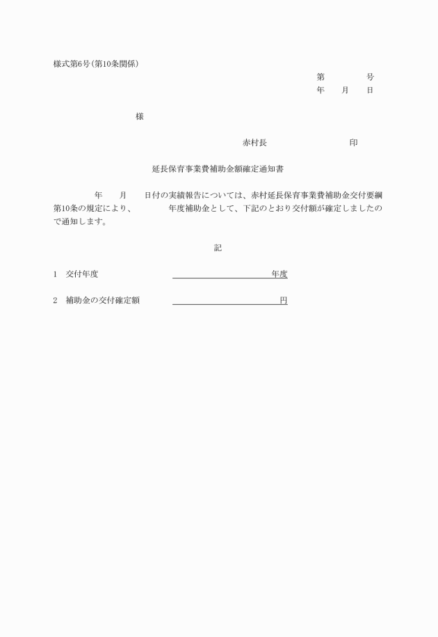 第6条 補助金の交付を受けようとする者(以下「申請者」という。)は、延長保育事業費補助金交付申請書(様式第1号)に必要書類を添えて、村長に提出しなければならない。