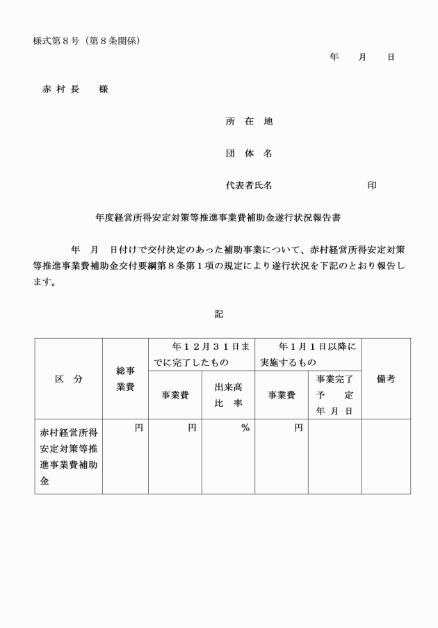 第7条 補助事業者は、補助金の概算払を受けようとするときは、経営所得安定対策等推進事業費補助金概算払請求書(様式第7号)を村長に1部提出しなければならない。