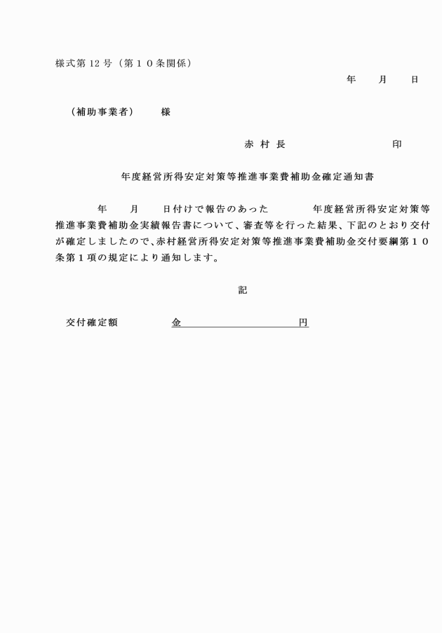 第4条 協議会は、補助金の交付を受けようとするときは、経営所得安定対策等推進事業費補助金交付申請書(様式第1号)に事業計画書及びその他村長が必要と認める書類を添えて、村長が定める日までに1部提出するものとする。