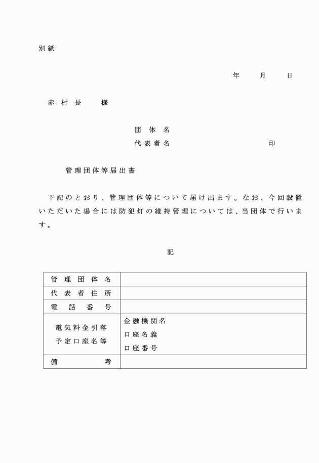 (3) この告示により、村が防犯灯設置後、村に代わり維持管理を行うこと。