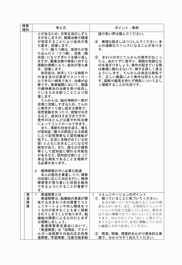 5 村は、障がい種別ごとの合理的配慮の考え方並びにポイント及び事例を別に定めて例示するものとする。なお、職員が合理的配慮を行うに当たっては、当該事例のみに限られるものではなく、当該事例を踏まえ、障がい者の性別、年齢及び障がいの状態に応じて、柔軟に対応しなければならない。