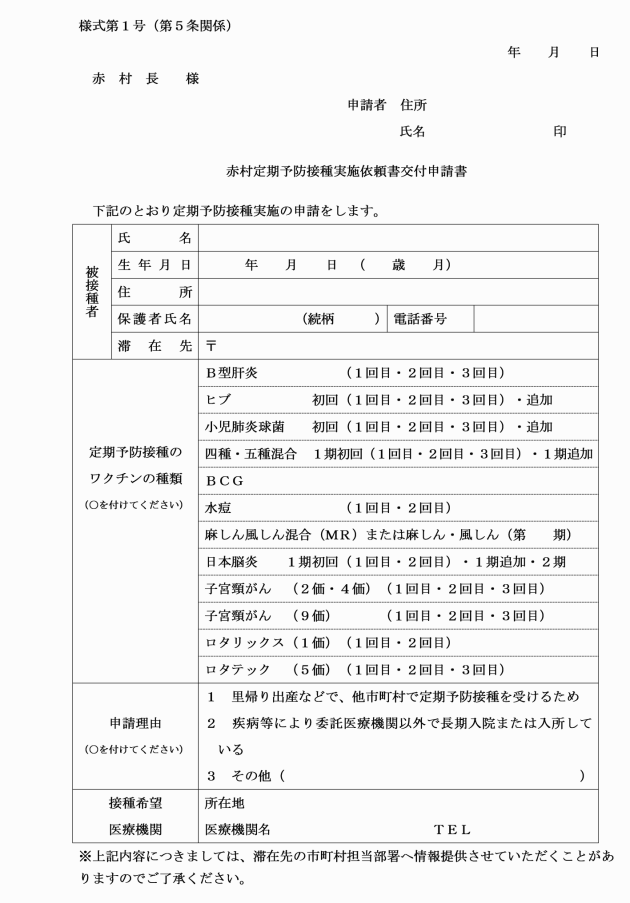 第5条 償還払を受けようとする者(以下「申請者」という。)は、定期予防接種を受ける前に、赤村定期予防接種実施依頼書交付申請書(様式第1号)を村長に提出しなければならない。
