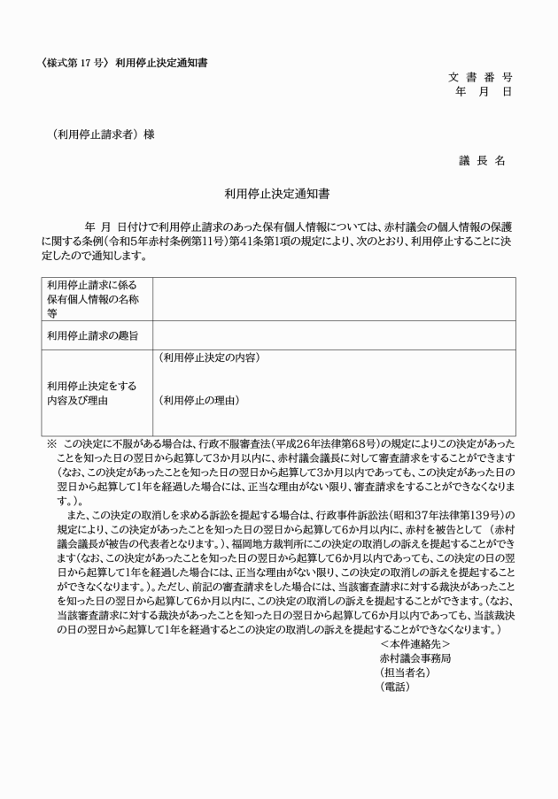 様式第17号 | 利用停止決定通知書 | 第24条第1項 |